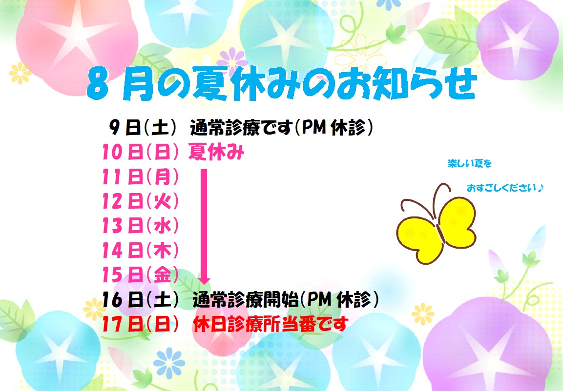 10月23日(火)よりインフルエンザワクチンの接種が始まります。期間中、火曜日午後の診察が15:30~となります。ご迷惑をおかけしますがよろしくお願いします。